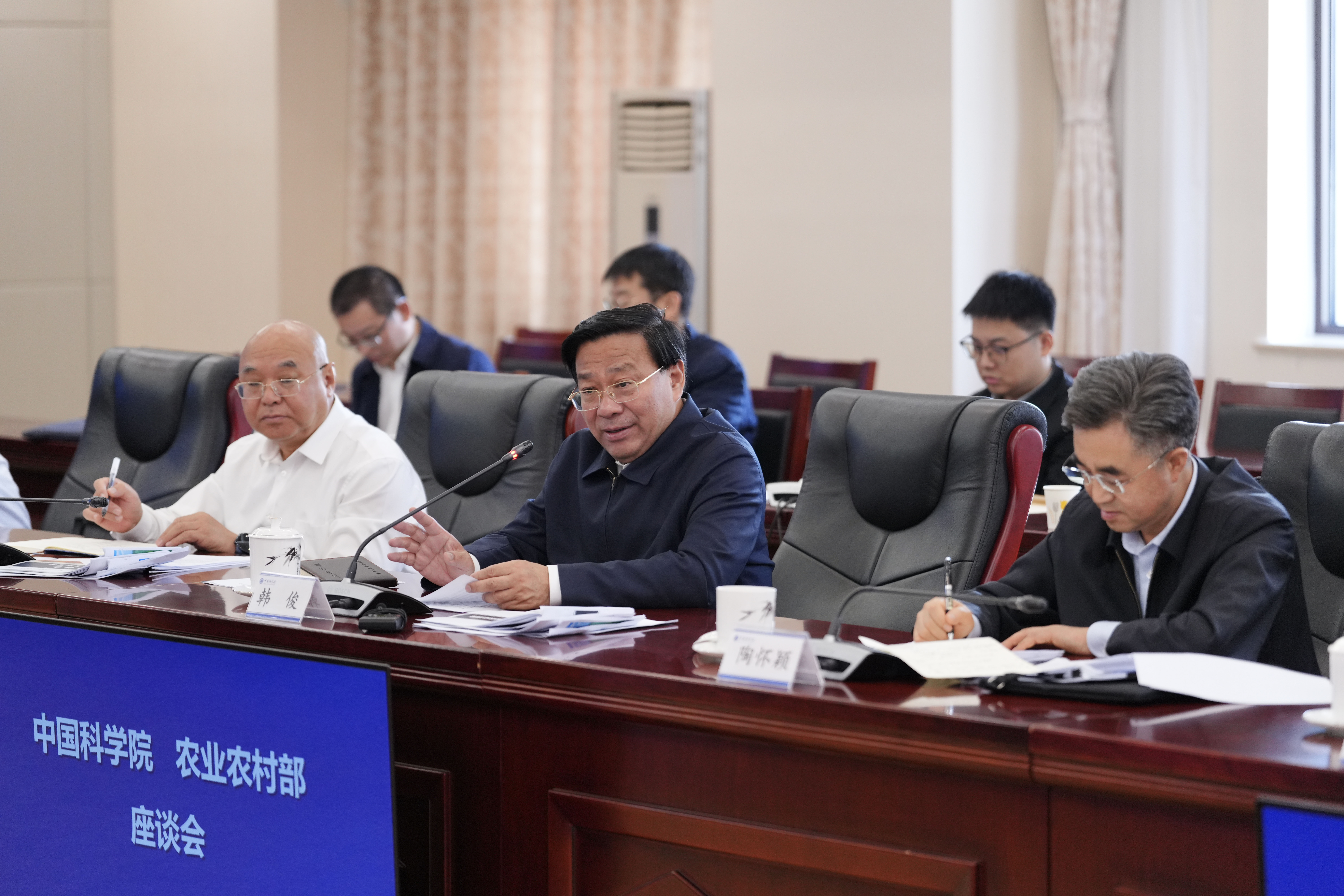 會談中,沈仁芳、姜明、傅向東、張玉成、種康、張佳寶、曹曉風、韓斌等院士專家先后發言,介紹了耕地保護建設、鹽堿地綜合改造利用、種業創新、智慧農業、新型飼草研發等方面的科研進展。韓俊認真聽取大家發言,就有關問題進行深入交流。他指出,習近平總書記高度重視農業科技創新,對加快實現高水平農業科技自立自強提出明確要求。希望雙方認真貫徹習近平總書記重要指示精神和全國科技大會部署,進一步加強溝通對接、深度合作,共同推動實現高水平農業科技自立自強。