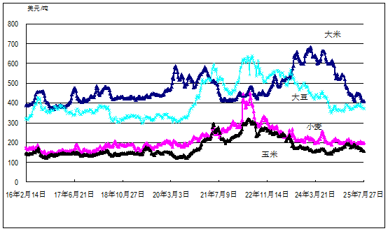 國(guó)際大宗農(nóng)產(chǎn)品周均價(jià)格走勢(shì)圖(2016年2月至今)