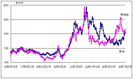 1. 豆油、棕櫚油、大米和小麥價(jià)格環(huán)比小幅上漲。美國(guó)芝加哥商品交易所豆油和小麥最近期貨合約收盤周均價(jià)每噸分別為1239美元和199美元,環(huán)比分別漲2%和1%,同比分別高23%和1%;馬來西亞棕櫚油荷蘭鹿特丹港到岸周均價(jià)每噸1322美元,環(huán)比漲2%,同比高30%;泰國(guó)100%B級(jí)和5%破碎率大米曼谷離岸周均價(jià)每噸分別為410美元和394美元,環(huán)比均漲1%,同比分別低31%和33%。